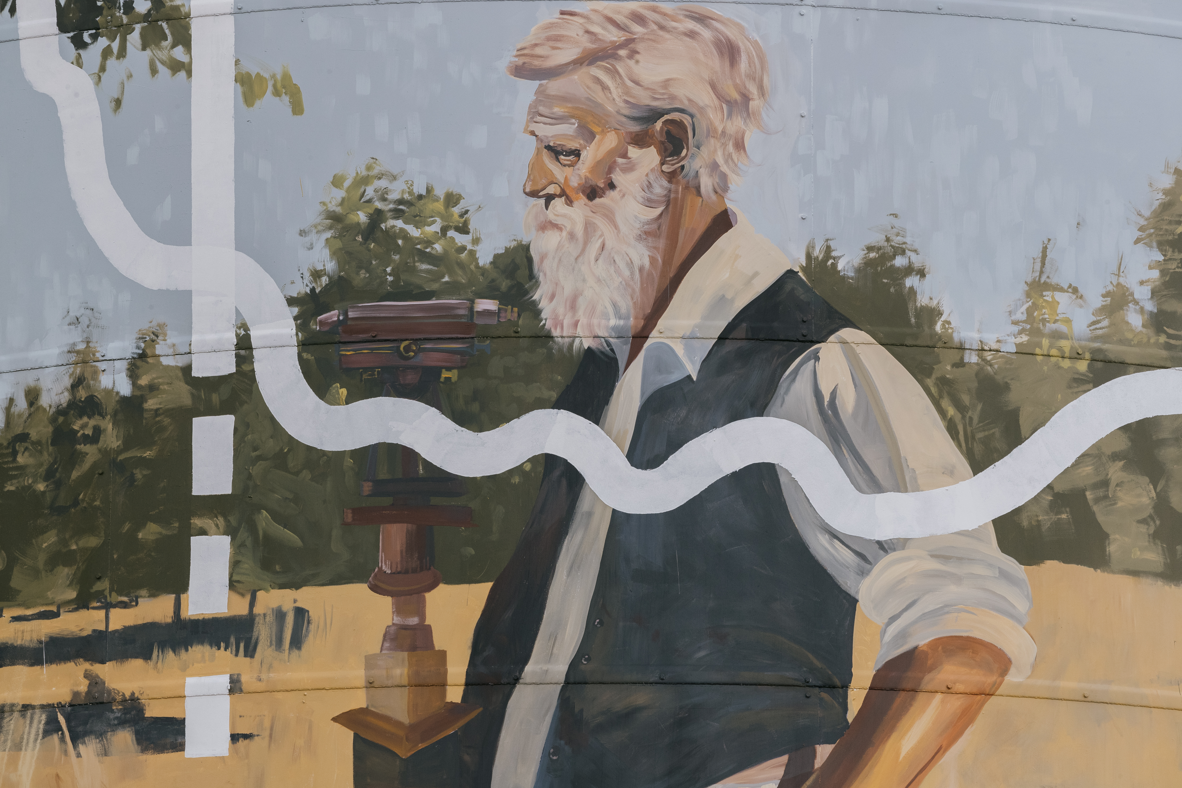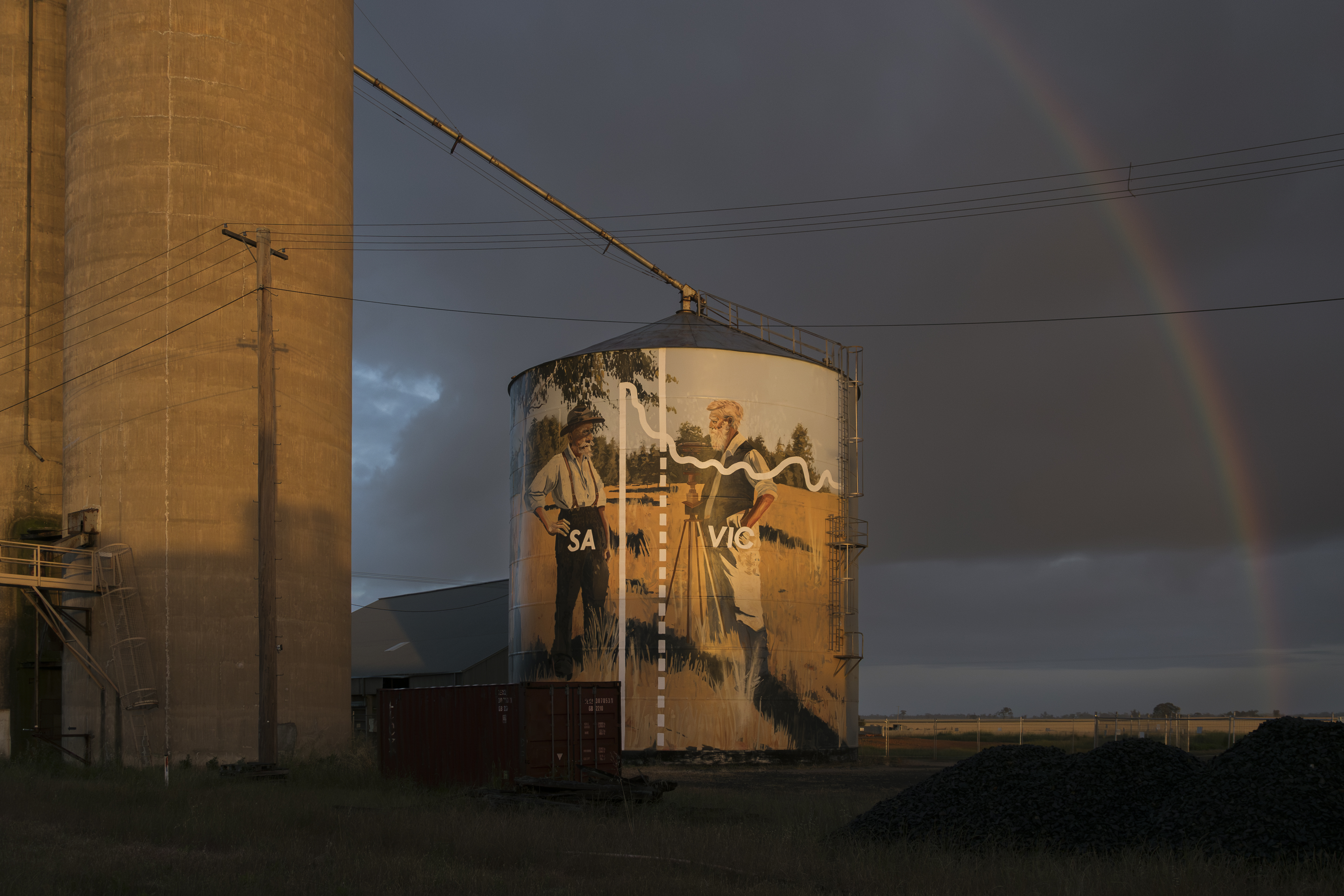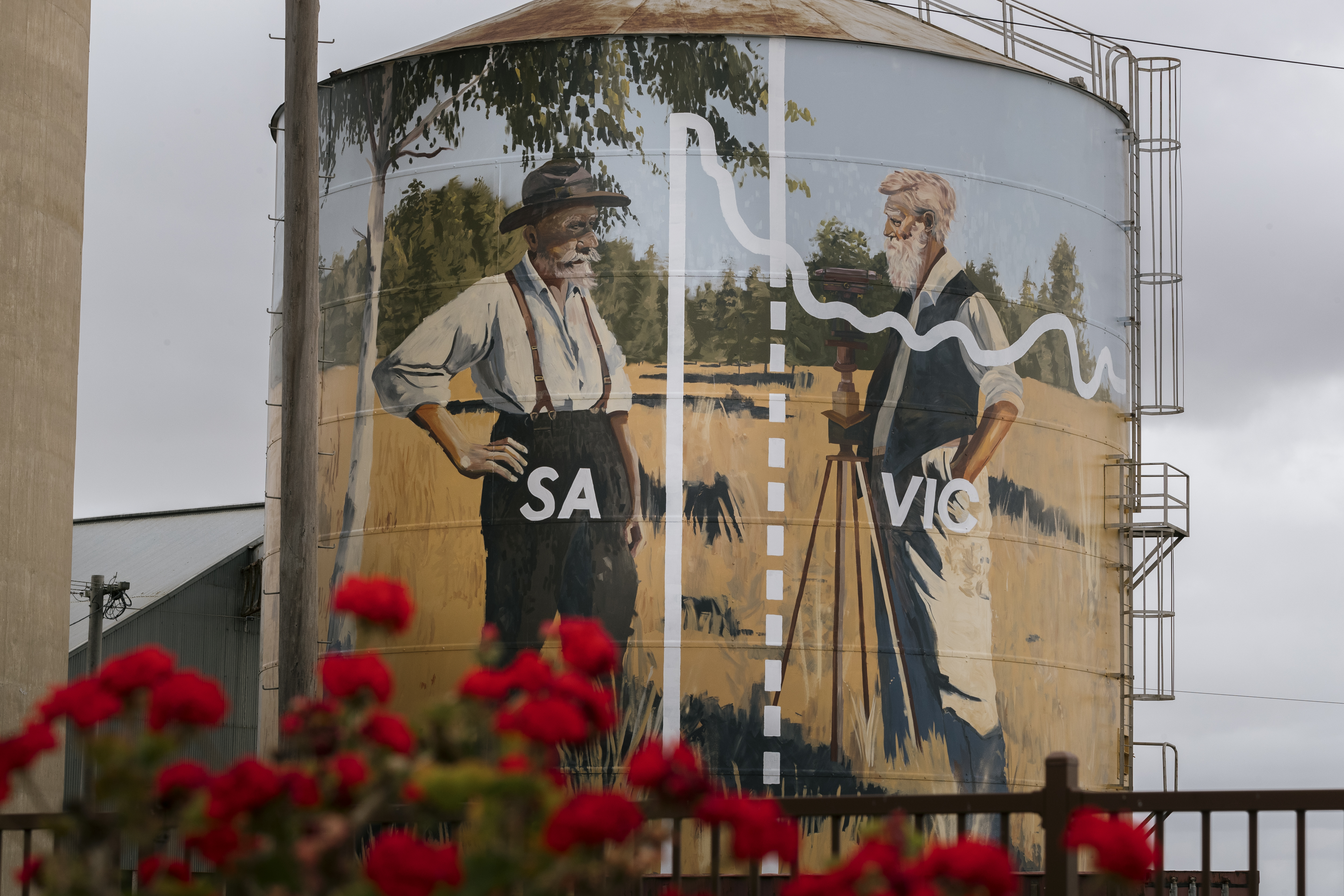 Painted in 2025 by artist Jack Fran and delivered by ArtAid in partnership with West Wimmera Shire Council and GrainCorp, the Serviceton silos showcase artwork inspired by the town’s unique past. The mural depicts the story of the border dispute and the work of surveyors Wade and White, who played a central role in defining the boundary between Victoria and South Australia.
